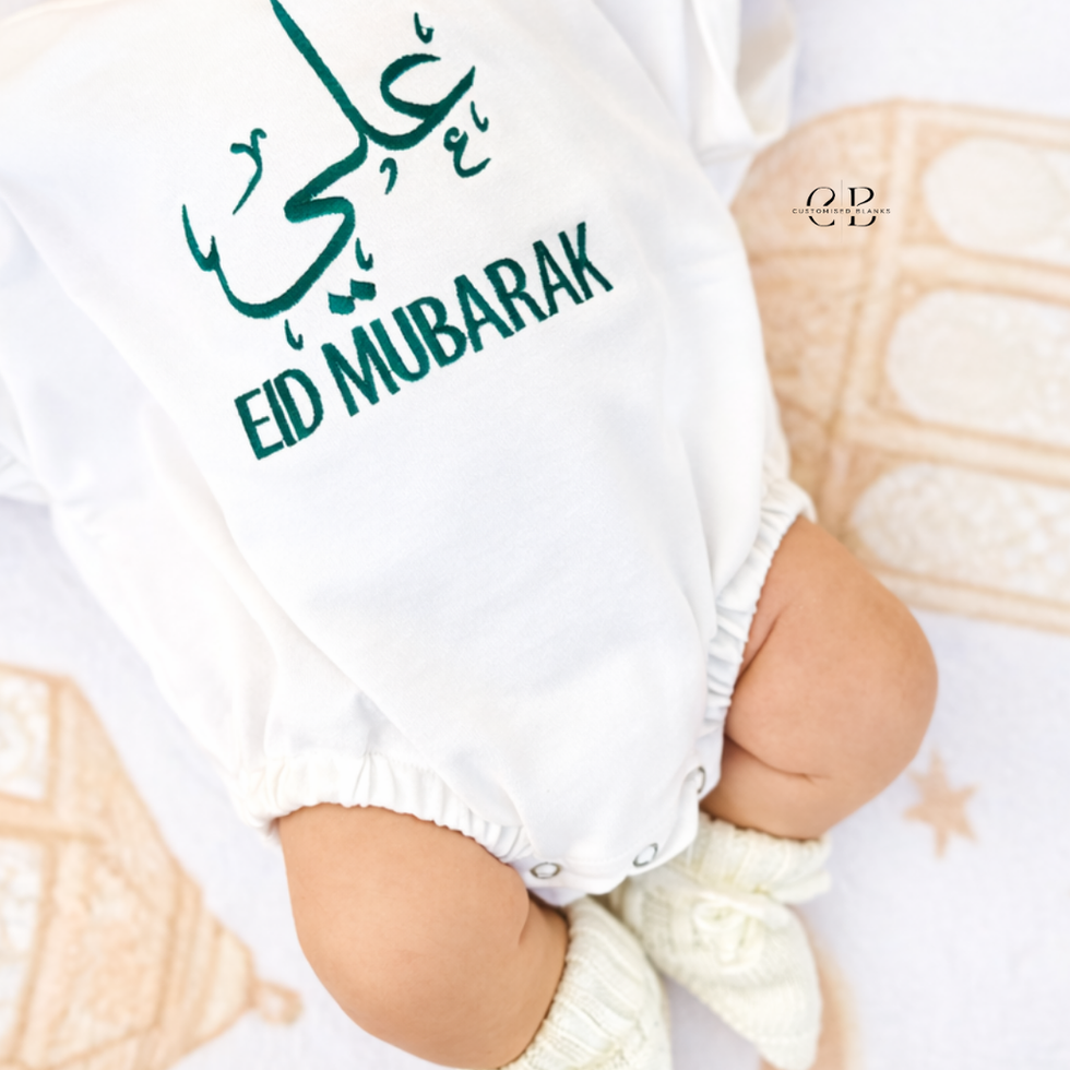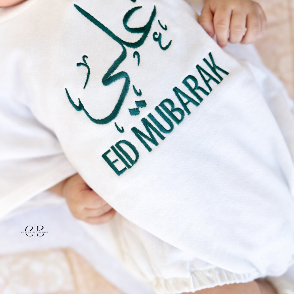 Your little one’s name will be beautifully embroidered in Arabic calligraphy, with Eid Mubarak stitched underneath using our premium Peacock thread (Colour 16).