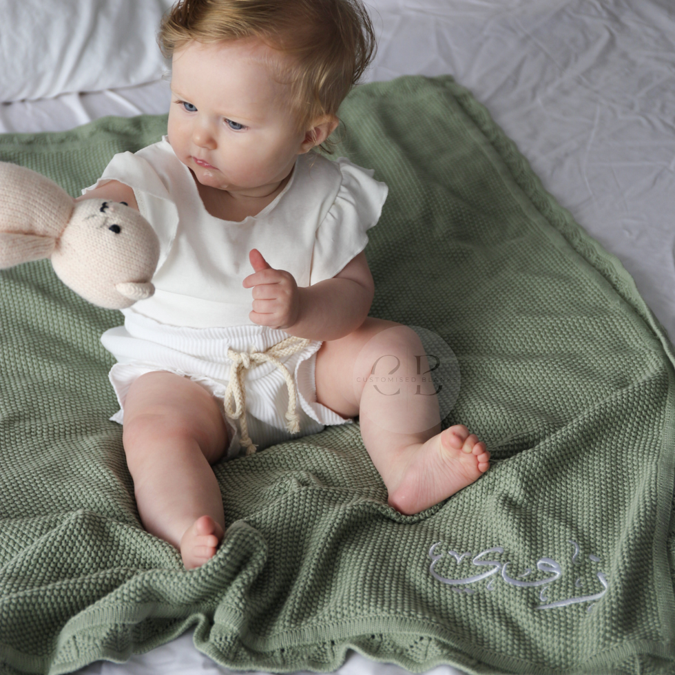 Wrap your little one in ultimate comfort and style with our hand-knitted Lace and Ruffle End Sage Baby Blanket with our Signature arabic calligraphy thread. Soft, breathable, and designed with delicate ruffle edges, these blankets are perfect for your baby’s nursery or as a thoughtful, personalised gift.