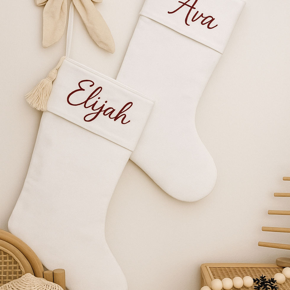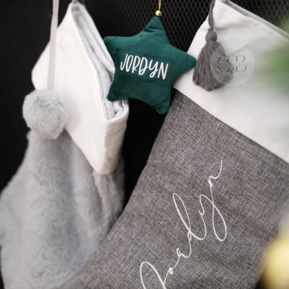 Add a timeless touch to your Christmas décor with our personalised linen stockings, available in White or Grey. Each stocking is customised with your chosen name, creating a special keepsake for the holiday season. Measuring 40cm x 20cm, they’re the perfect size for festive treats and gifts. Every order also comes with a bonus faux stocking in a random colour – two stockings in one!