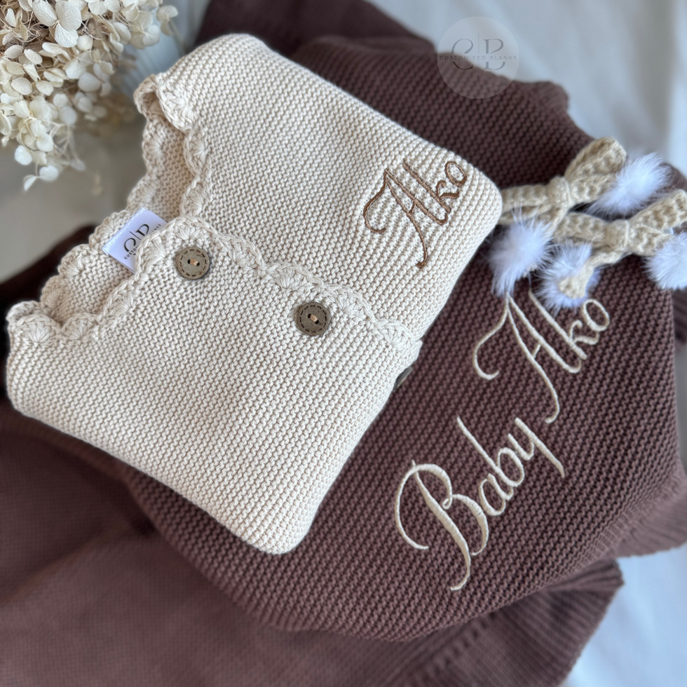 This beautifully coordinated bundle includes a beige baby cardigan adorned with delicate lace trim and a matching knitted ruffle-end blanket, both custom-embroidered with your baby’s name in high-quality, lasting thread. Each stitch is crafted with care, creating a keepsake that’s as special as the moments it celebrates.